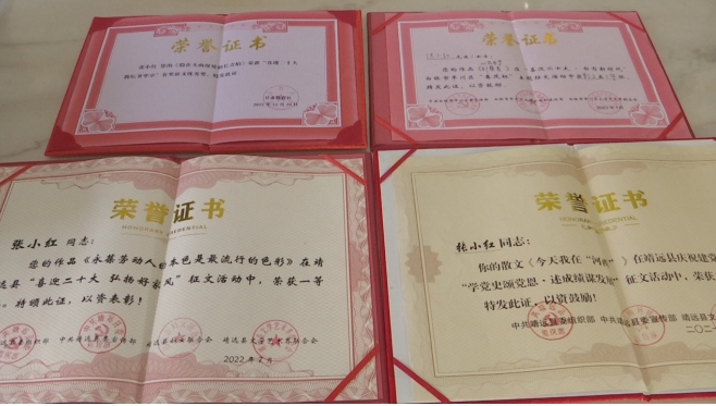 一分耕耘,一分收獲,機會總給有心人。如今,張小紅加入了靖遠縣作家協(xié)會、白銀市作家協(xié)會、白銀市文藝評論家協(xié)會成為了會員,也增選為靖遠縣政協(xié)委員。她的作品散見于《白銀文學(xué)》《烏蘭》等報刊雜志以及“靖遠作協(xié)”“隴上風情”“黃土情文學(xué)”等文學(xué)公眾號;部分作品榮獲靖遠縣建黨100周年“學(xué)黨史頌黨恩·述成績謀發(fā)展”征文二等獎,“喜迎二十大·教壇著華章”《未來導(dǎo)報》有獎?wù)魑膬?yōu)秀獎等……