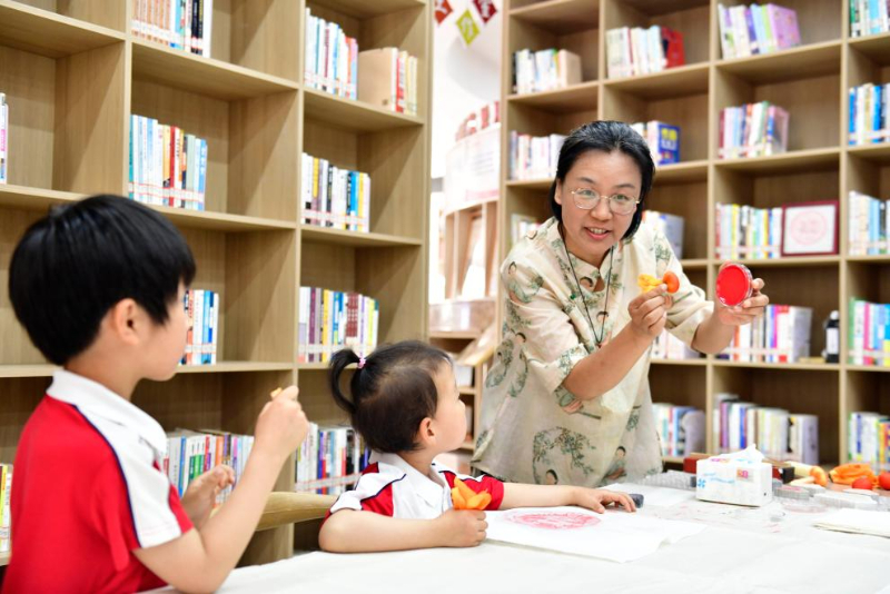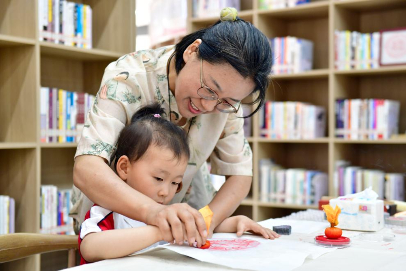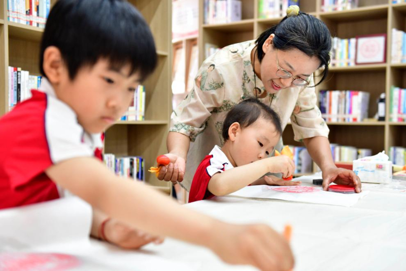 5月23日,在日照市東港區(qū)城市書房石臼所館,志愿者在教孩子拓印。