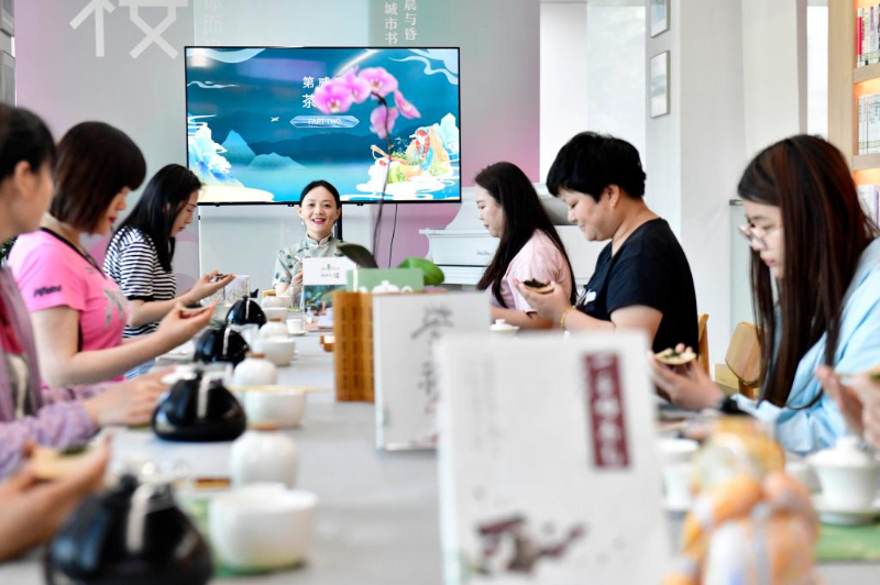 5月23日,市民在日照市東港區(qū)城市書房櫻花園館學習茶藝。