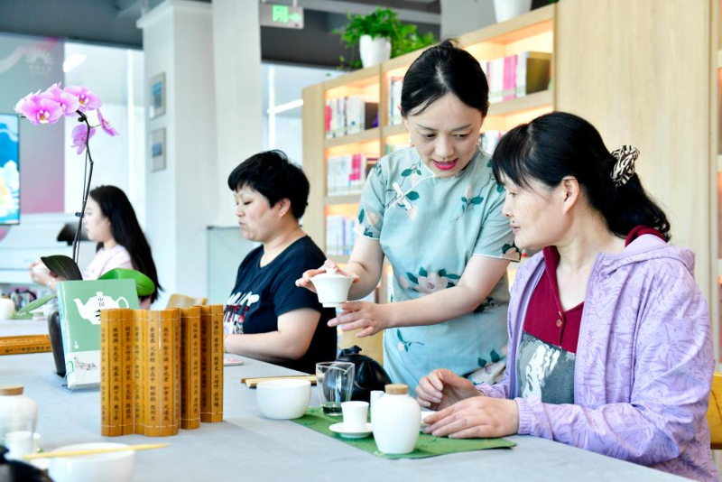 5月23日,在日照市東港區(qū)城市書房櫻花園館,茶藝師張娜(右二)教市民茶藝。