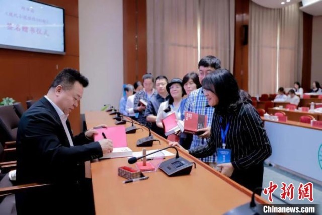 圖為邱華棟向部分參會(huì)代表進(jìn)行現(xiàn)場(chǎng)簽名贈(zèng)書?!?nèi)蒙古師范大學(xué)供圖
