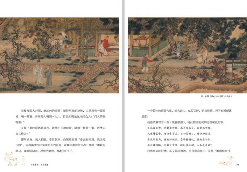 值得一提的事,這本書有很多稀見的插圖。比如讀到司馬相如的時(shí)候,配有明代仇英的《上林圖》;比如說曹植,所用的顧愷之《洛神賦圖》也是根據(jù)曹植傳世名篇《洛神賦》而來;寫白居易則是用謝環(huán)的《香山九長老圖》。