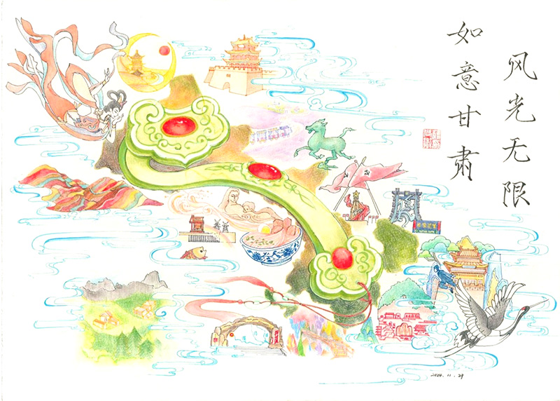 筆者作為編者之一,在一開始接觸到“如意甘肅”這個概念時,就感受到了一種撲面而來的畫面感和強烈的色彩張力,而在精讀《如意甘肅》的過程中,這種感覺愈發(fā)清晰和強烈,一幅黃土高原、廣袤草原、茫茫戈壁、潔白冰川為底色,十四個市州的人文自然美景簇擁環(huán)繞,一柄通體翠綠、晶瑩無瑕的“玉如意”居中凝型,璀璨奪目的文化如點點紅寶石鑲嵌其中的構(gòu)圖呼之欲出。隨著理解認識的逐步深入,本書喚起了我的思想共鳴和對家鄉(xiāng)深沉熱烈的情感流動,并繪制了這幅印象畫,以填補文字和語言所不能盡興之處。我真切地希望,隨著《如意甘肅·甘肅省情研究》的發(fā)行和推廣,隨著美好甘肅的不斷發(fā)展和進步,在未來,人們心中的甘肅,不再是“苦瘠甲于天下”的荒涼意象,而是這柄溫潤澄澈、莊重堅實的“玉如意”,和圍繞著、托舉著它的那些繽紛美景和璀璨文化!