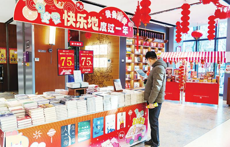 2月4日,讀者在甘肅省新華書店西北書城設(shè)置的“迎新悅讀啟航2025”炫春精品圖書聯(lián)展展臺前挑選自己喜歡的圖書。