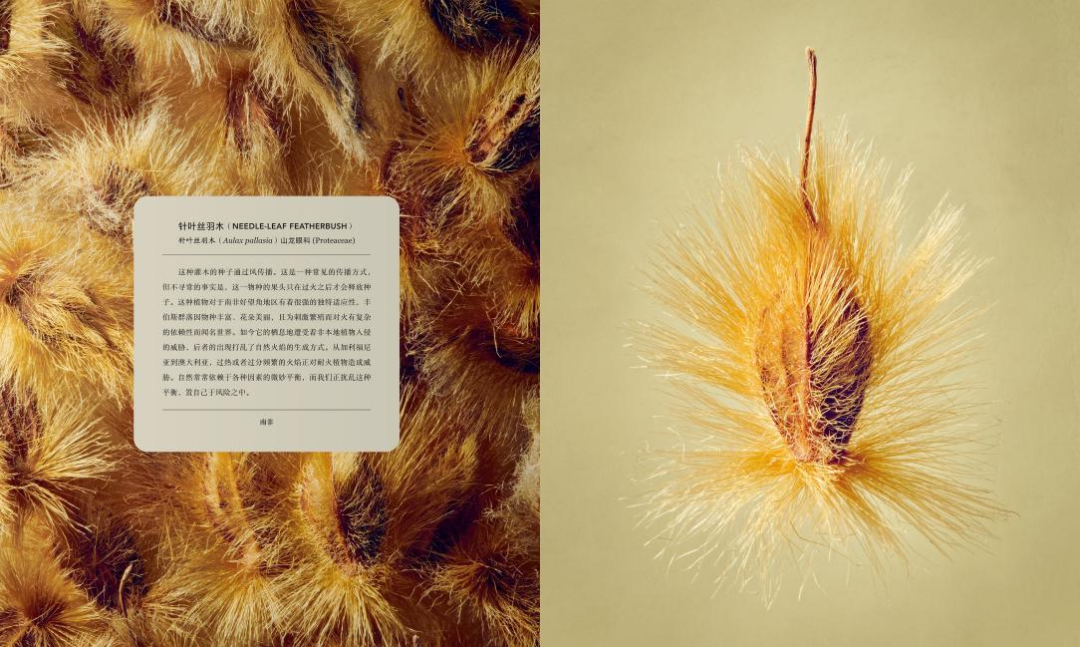 隨后,植物園耗時(shí)6個(gè)月,從3500份標(biāo)本中精心篩選出100種植物果實(shí)與種子。列文·比斯將這些攝影對象放大至80倍,捕捉到植物表面豐富多樣的細(xì)節(jié),照片的精細(xì)程度超乎想象。每張圖片還配有一段簡潔的科普文字,不僅反映了100多年來植物的采集狀況,展示了種子的傳播方式,還介紹了人類對植物材料的利用方法。
