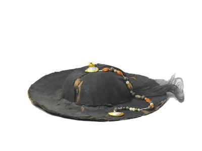 這一頂鑲寶石鈸笠帽,可要豪華貴重得多,這是一頂帽頂垂有一串玉石珠串飾的帽子,帽的直徑有35厘米?!洞笤湔隆吩涊d有人搶走蔡國祥懸有紅瑪瑙珠串的棕帽的事。可見帽上垂串飾也是元代貴族的風氣。這種帽子的流行始于元成宗大德年間(1297—1307),一個商人賣給官府一塊紅剌子(紅寶石)重一兩三錢,用于鑲嵌帽頂。從此以后,歷代皇帝相承。凡元旦及天壽節(jié)大朝賀時都戴這種鈸笠帽。漳縣元代汪世顯墓出土的這頂鈸笠帽,帽頂鑲金裹玉,由帽頂垂系31顆珠玉組成的串練。以珠玉寶石來裝飾帽子,帽子的價值之高昂自不待言。