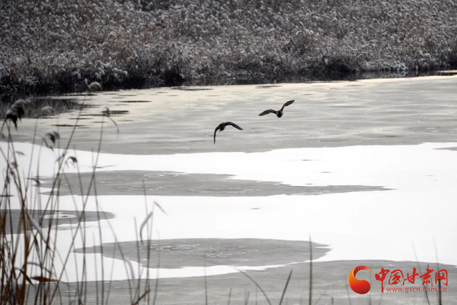 黑白相間的珍禽點(diǎn)綴尚未結(jié)冰的湖面