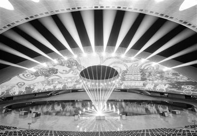 華夏文化展示中心分為展演區(qū)與展示區(qū)兩個(gè)部分,展示區(qū)為古鎮(zhèn)式商業(yè)街,目前已進(jìn)入收尾階段,展演區(qū)為大型激光水舞秀劇場(chǎng)——日月館,去年已試運(yùn)營(yíng),效果極佳。別名“黃河巨蛋”的日月館總用地面積為12000平方米,場(chǎng)館外形呈半橢圓形,由兩片獨(dú)立的頂棚覆蓋,場(chǎng)館高30米,寬約80米,內(nèi)設(shè)觀(guān)眾席位1450座。場(chǎng)館屋頂?shù)奶煅坶_(kāi)口和場(chǎng)館地面體現(xiàn)了中國(guó)天圓地方的理念以及太陽(yáng)和月亮的互相映襯。外立面采用了與當(dāng)?shù)貍鹘y(tǒng)屋頂瓦片相呼應(yīng)的獨(dú)特形狀,又像鳥(niǎo)兒折疊的翅膀和羽毛,極富活力和寓意。
