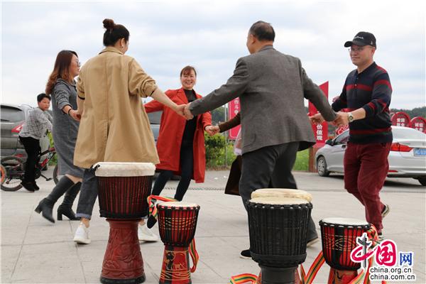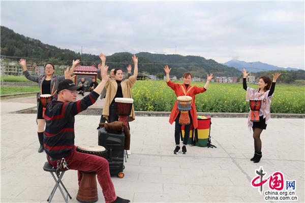 3月22日中午,湖南省隆回縣司門前鎮(zhèn)學(xué)堂灣村,文化志愿者教村民打手鼓、跳舞,吸引一旁踏青的游客前來(lái)觀摩。