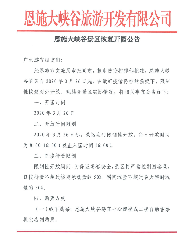 恩施大峽谷旅游開(kāi)發(fā)有限公司今天發(fā)布《恩施大峽谷景區(qū)恢復(fù)開(kāi)園公告》(以下簡(jiǎn)稱《公告》),2020年3月26日起,恩施大峽谷景區(qū)恢復(fù)開(kāi)園。值得注意的是,恩施大峽谷將實(shí)行限制性開(kāi)放,每日開(kāi)放時(shí)間為8:00-16:00(截止入園時(shí)間16:00)。