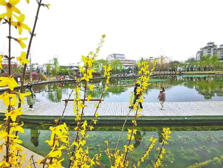 四月春日,五彩繽紛。小西湖公園里,迎春花、桃花等競相開放,引來蜜蜂、蝴蝶穿梭其中,微風(fēng)拂過,飄來陣陣花香。清澈的湖水,嫩綠的草地,公園內(nèi)四處皆有春天的顏色。