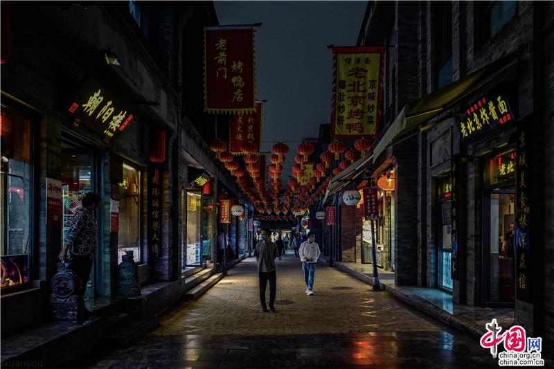昨天(5月21日)下午三點(diǎn)半后,北京的天氣突然由白天變成了黑夜,當(dāng)時(shí)小編正在前門鮮魚口美食街拍攝,光線的明暗變化中,民國(guó)風(fēng)的灰墻青瓦的街道,忽然生出幾分魅惑而神秘的美感,紅燈籠在風(fēng)雨中搖曳、巨大的京劇招貼畫在墻上,胡同里人影憧憧……