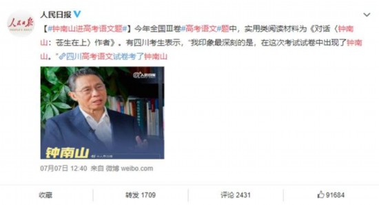 不過,他沒想到,今年全國Ⅲ卷高考語文題中,實用類閱讀材料為《對話〈鐘南山:蒼生在上〉作者》。有四川考生表示,“我印象最深刻的是,在這次考試試卷中出現(xiàn)了鐘南山。”