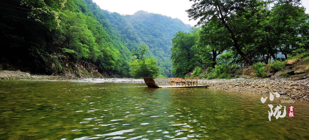 撐一葉竹筏在月牙潭之上,碧波蕩漾,山水一色,你能清晰的看見水底機靈的魚群,因你們闖入,驚慌的竄入沉積在水底的石縫中。遠遠望去,翠嶺逶迤,湖中碧波如鏡,嵐影倒懸,人在畫中游的意境躍然于心。
