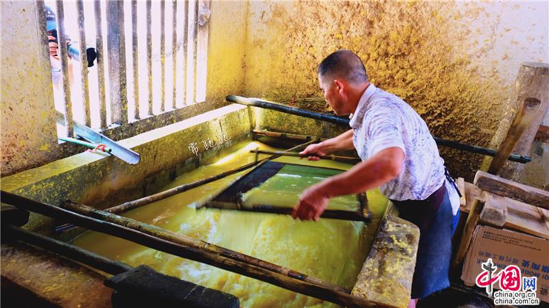隆回縣灘頭鎮(zhèn)桃林村手工抄紙作坊,已經成為一處著名的文旅項目景點。走進陶林村,一棟棟青瓦石墻的新屋吸引了人們的目光。屋外山坡竹林茂密,山溪流水潺潺,屋內手工抄紙制作的原料、工具布置的次序井然,手工抄紙的全套工藝流程在這幾棟屋中得以完整體現(xiàn)。手工抄紙技術歷史悠久,始于隋唐,至明朝時抄紙已經非常盛行。上世紀八十年代鼎盛時還曾遠銷東南亞和日本。非遺傳承人李志軍今年61歲,自稱“紙蟲”,帶領著全家人承襲著祖宗留下的獨特技藝。而支撐著李志軍的堅守的,是隆回縣文旅部門的巨大付出和努力。2011年,他們支持李志軍建立了手工抄紙標準化作坊,2016年又對該作坊進行擴建,使之成為國家級非遺項目。灘頭手工抄紙作坊占地面積1714平方米,是灘頭手工抄紙有史以來最大的作坊,同時也是集生產、創(chuàng)新、傳承、展示、研學為一體的重要基地和文旅基地。