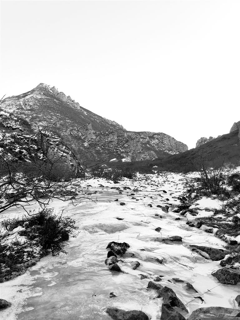 穿過公路就來到露骨山腳下,山間灌木叢生,枯葉凋零,一夜的小雪也使天空更加清澈。上山的路,總體是溯溪而上,不過腳下的小溪已經變成冰河,但潺潺水聲不時在耳邊響起,大小石塊橫亙在冰河之上,白雪覆蓋其間,我們一行沿著前人在雪地留下的腳印,撥開齊胸的灌木枝,深一腳淺一腳、兜兜轉轉向前行。