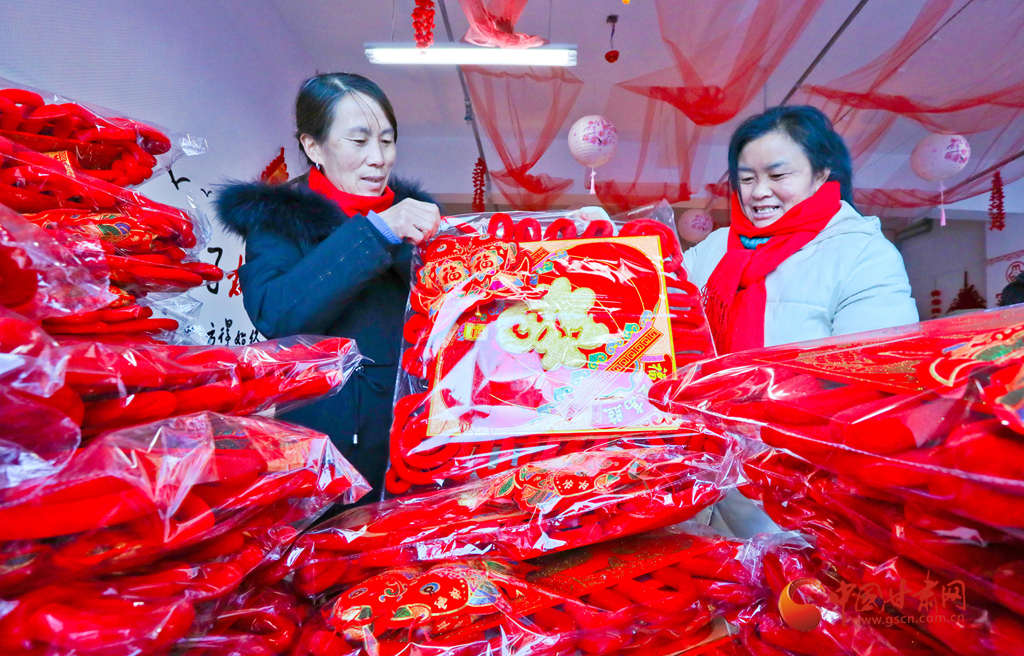 1月6日,甘肅民樂生態(tài)工業(yè)園區(qū)的巾幗扶貧車間內(nèi),女工們在包裝編織好的中國結(jié)準(zhǔn)備發(fā)運(yùn)。