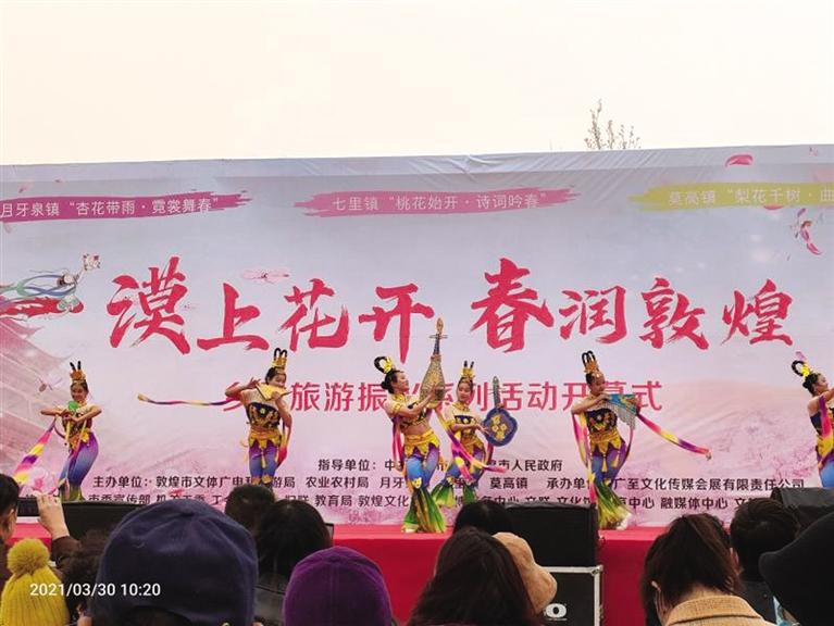 三月的敦煌,春風(fēng)拂面,漠上花開。鳴沙山下,十里杏花爭(zhēng)相綻放;黨河兩畔,千畝桃花含苞待放;春風(fēng)蕩漾,早酥梨基地花苞滿枝丫。鮮花以自己的嬌媚打開了戈壁大漠的春天。敦煌市將以“春”為韻腳,“花”為主角,開展“漠上花開·春潤(rùn)敦煌”鄉(xiāng)村旅游振興系列活動(dòng)。包括“杏花帶雨·霓裳舞春”“桃花始開·詩(shī)詞吟春”“梨花千樹·曲藝鬧春”3場(chǎng)主場(chǎng)活動(dòng),以及徒步踏青、康體騎行、研學(xué)體驗(yàn)等5項(xiàng)主題活動(dòng),并將組織開展敦煌服走秀、桃花詩(shī)會(huì)、非遺曲子戲表演等多項(xiàng)鄉(xiāng)村旅游特色配套活動(dòng)。