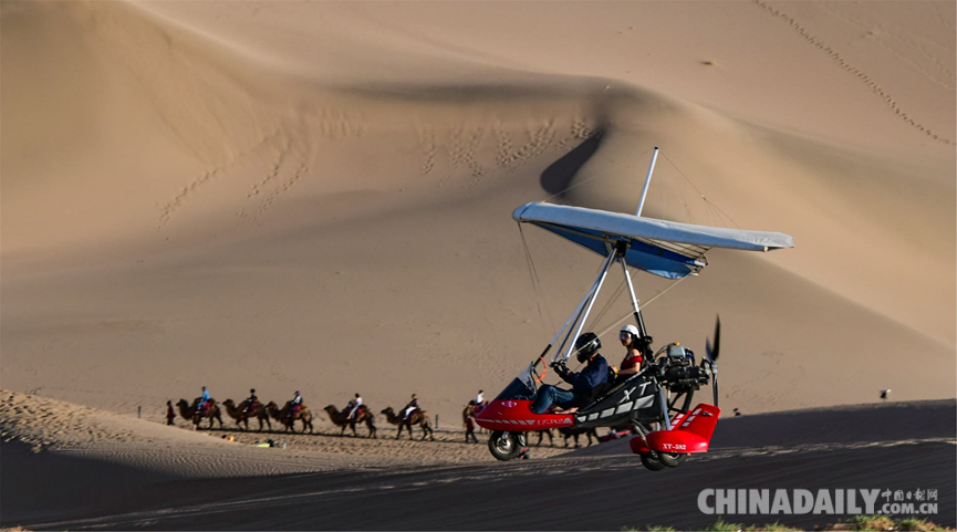5月6日,游客乘坐滑翔機從空中鳥瞰敦煌大漠風光。