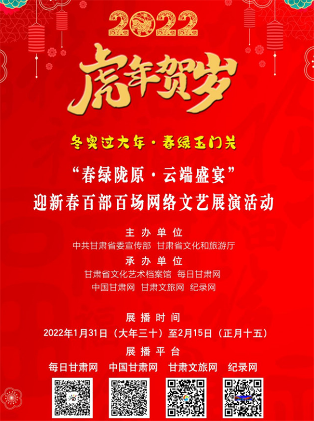 甘肅省博物館在春節(jié)期間舉辦了“虎虎生福——壬寅(虎年)新春生肖文物聯(lián)展”,甘肅省圖書館舉辦7大專題30余項(xiàng)文化體驗(yàn)活動(dòng)。在“春之華章”2022年甘肅省電視春節(jié)聯(lián)歡晚會(huì)上,原創(chuàng)話劇《八步沙》、隴劇《大禹治水》等精彩上演;甘肅省非遺保護(hù)中心開展了“虎虎有神過大年——如意甘肅·多彩非遺”宣傳推廣活動(dòng);甘肅演藝集團(tuán)通過線上線下結(jié)合方式,開展2022“我們的中國(guó)夢(mèng)”——文化進(jìn)萬家迎新春文藝演出活動(dòng);張掖市舉辦春節(jié)“九曲黃河燈陣啟燈納福非遺文化展演”活動(dòng)。