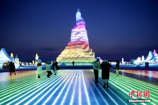 2月21日,游客在3D感應(yīng)冰面上拍照。連日來,冰雪大世界的客流量迎來小高峰,單日客流量可達四五千人。 中新社記者 姜輝 攝