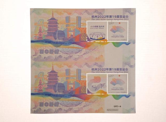 據(jù)了解,《杭州2022年第19屆亞運會》特殊版式個性化郵票雙連張是中國集郵有限公司匠心打造的首款GPZ編號體育題材郵票,由青年設計師趙郁竹擔綱設計,限量發(fā)行。它依托杭州亞運會色彩系統(tǒng)和視覺形象元素,融歷史文化、現(xiàn)代美學和未來暢想于一體,集藝術感、科技感和運動感于一身,展現(xiàn)中華文明、浙江風采、杭州韻味和時代魅力,采用特殊版式、編號和工藝,紫光燈下局部呈現(xiàn)無色熒光油墨圖案和全真彩效果,傳遞中國郵政對杭州亞運的美好祝福。(圖片由人民日報客戶端提供)