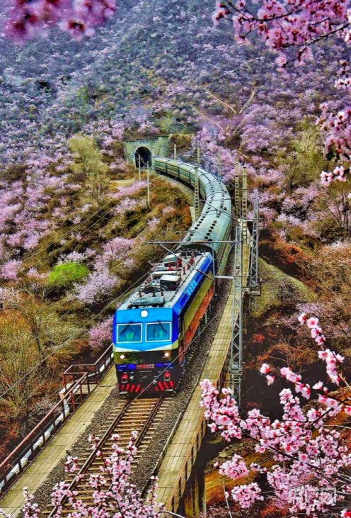 央廣網蘭州4月2日消息 (記者 邸文炯 通訊員 王紅剛 孫淑霞)近日,甘肅省崇信縣峽門寶中鐵路華亭市安口窯站附近的山上桃花盛開,花香四溢、如煙似霞。火車從山中的隧道穿行而過,駛向一片春光燦爛。