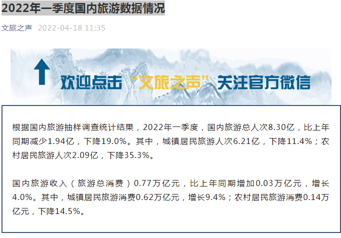 今天,文化和旅游部公布了2022年一季度國內(nèi)旅游數(shù)據(jù)情況。統(tǒng)計數(shù)據(jù)顯示,2022年一季度,國內(nèi)旅游總?cè)舜?.30億,比上年同期減少1.94億,下降19.0%。其中,城鎮(zhèn)居民旅游人次6.21億,下降11.4%;農(nóng)村居民旅游人次2.09億,下降35.3%。