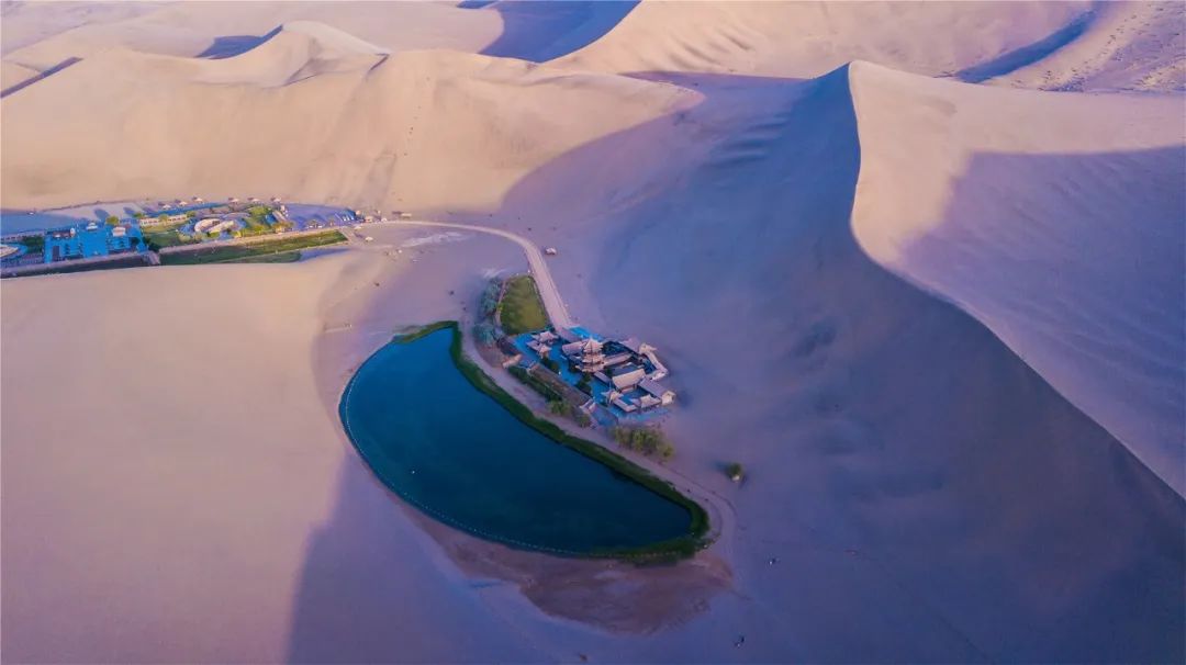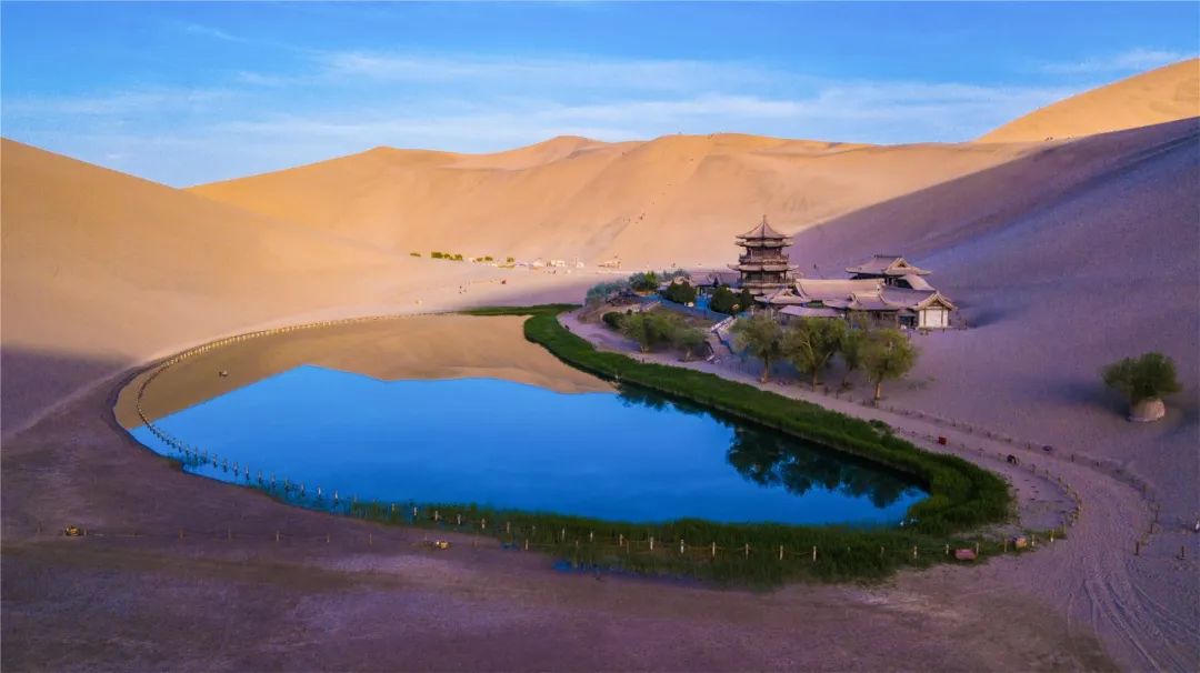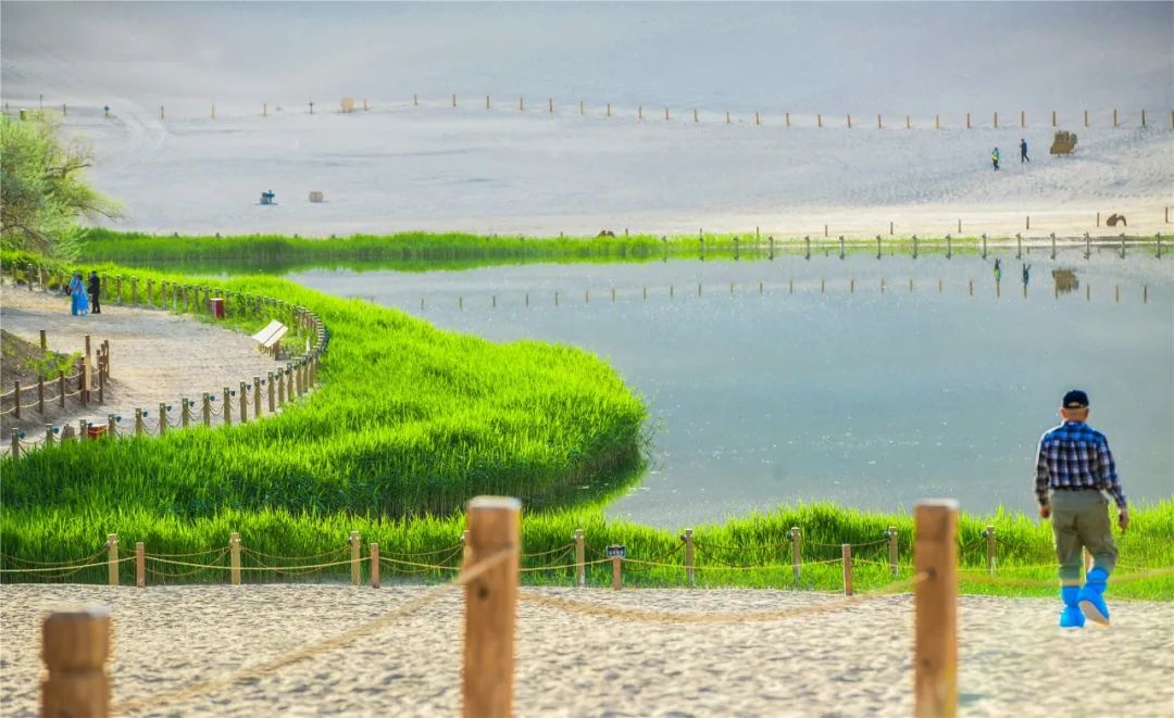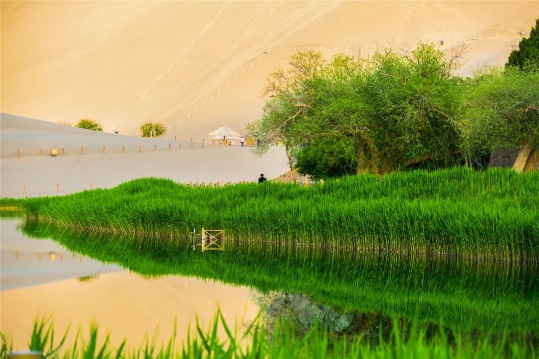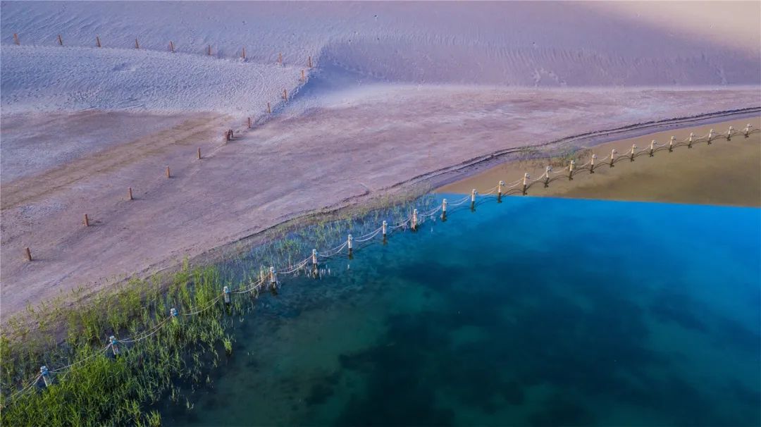 今年4月,敦煌市氣候溫潤,雨水較多,鳴沙山月牙泉景區(qū)草木蔥蘢,月牙泉水位持續(xù)上升。從4月23日在月牙泉航拍的圖片可以看出,月牙泉水域面積逐漸擴大,泉水已滲出月牙泉圍欄之外近1米的距離。據(jù)悉,3年前月牙泉泉水一直保持在圍欄之內(nèi)。