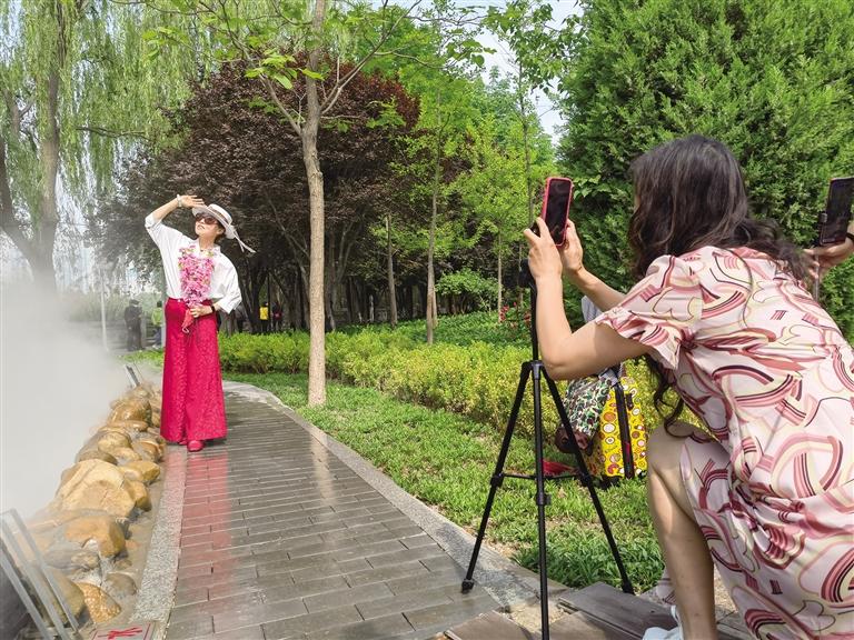 在記者采訪的一個小時里,有寶媽帶著萌娃、有小姐妹相約帶著專業(yè)攝影師、有白發(fā)老人獨自賞景、有健身團隊前來留影、有年輕人身著漢服打卡……游客絡(luò)繹不絕,即便烈日當頭,也擋不住大家駐足拍照的熱情。