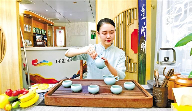 這趟列車由6節(jié)軟臥車廂、1節(jié)餐車、1節(jié)休閑娛樂功能車組成,車體內(nèi)外隨處可見平?jīng)鑫幕糜卧?。記者在車廂?nèi)看到,崇信龍泉寺、華亭安口窯古村落、靜寧仙人峽……每一間軟臥門上都是絕美的平?jīng)鲲L(fēng)光大片,整個(gè)車體儼然移動(dòng)的“平?jīng)鑫穆谜桂^”,讓人“身未動(dòng),心已遠(yuǎn)”。車體中部的功能車,更是顛覆了以往人們對(duì)火車的認(rèn)知,麻將桌、功夫茶、全套的K歌設(shè)備,還有平?jīng)鎏厣穆蒙唐?、農(nóng)特產(chǎn)品展銷區(qū),平?jīng)鑫穆脮営[區(qū)、平?jīng)鑫幕黝}報(bào)刊欄,足以打發(fā)游客在旅途中的無聊時(shí)光。餐車也極富特色,車廂頂部裝飾有色彩豐富的藻井圖案,飛天仙子衣袂飄飄、環(huán)繞四周。“在這樣的餐車上吃飯,吃的那是品位。”一位乘客開心地和同行的伙伴說著。62歲的張女士一到平?jīng)鼍兔Σ坏亟o女兒發(fā)微信,“火車上住得舒適,服務(wù)好,環(huán)西部火車游·崆峒號(hào)很超值!”