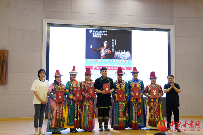 中國甘肅網(wǎng)7月1日訊 近日,甘肅裕固族歌唱組合薩爾組合主唱薩爾帶著他的裕固族伙伴們走進(jìn)西北師范大學(xué)音樂學(xué)院,進(jìn)行“課程思政教學(xué)實(shí)踐”——《裕固族民歌中的服飾文化》交流分享活動。同時,西北師范大學(xué)音樂學(xué)院副院長晏曉東為七位裕固族民間音樂傳播者頒發(fā)了音樂學(xué)院聘書。