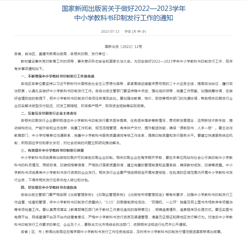 《通知》中表示,要不斷增強(qiáng)中小學(xué)教科書印制發(fā)行工作使命感。