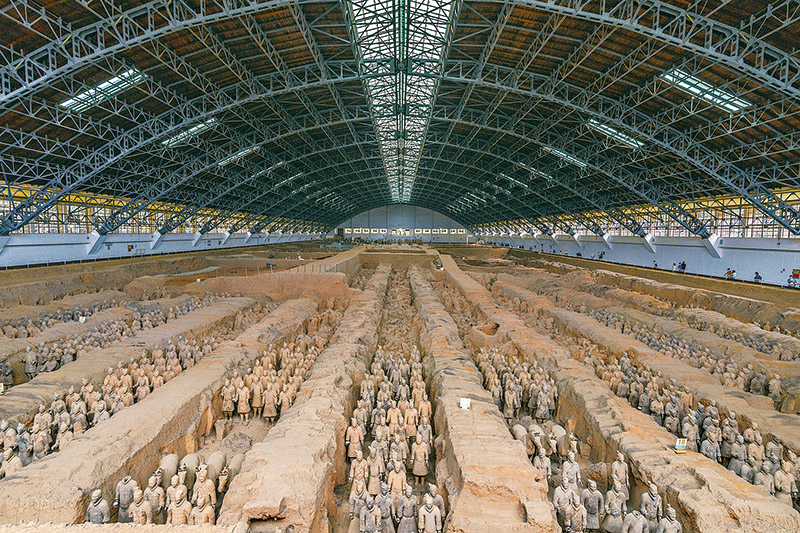 秦始皇陵是中國歷史上第一個多民族的中央集權(quán)國家的皇帝秦始皇于公元前246年至公元前208年營建的。作為秦始皇陵陪葬墓坑之一的兵馬俑坑于1974年被發(fā)現(xiàn),被譽(yù)為“世界第八大奇跡”。圖為秦始皇兵馬俑博物館一號坑全景?!∪嗣駡D片 丁俊豪/攝