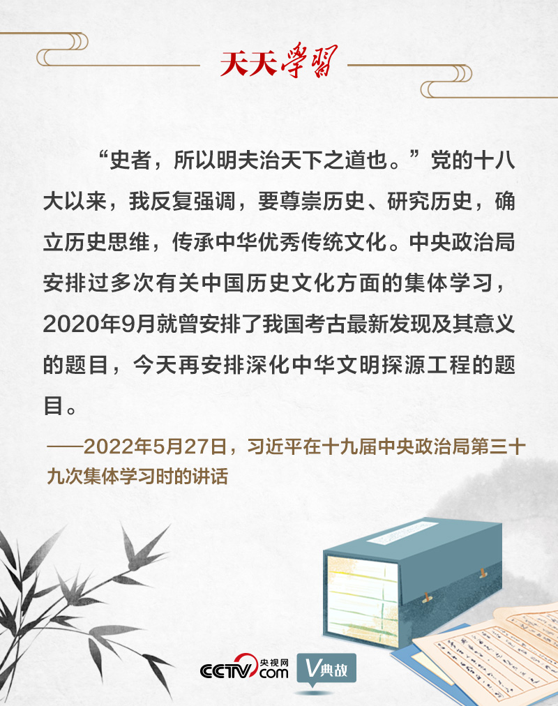 為深入了解中華文明五千多年發(fā)展史,推動(dòng)把中國(guó)文明歷史研究引向深入,推動(dòng)全黨全社會(huì)增強(qiáng)歷史自覺(jué)、堅(jiān)定文化自信,2022年5月27日,十九屆中央政治局就深化中華文明探源工程進(jìn)行第三十九次集體學(xué)習(xí)。習(xí)近平總書(shū)記引用古語(yǔ)“史者,所以明夫治天下之道也”,強(qiáng)調(diào)要尊崇歷史、研究歷史,確立歷史思維,傳承中華優(yōu)秀傳統(tǒng)文化。