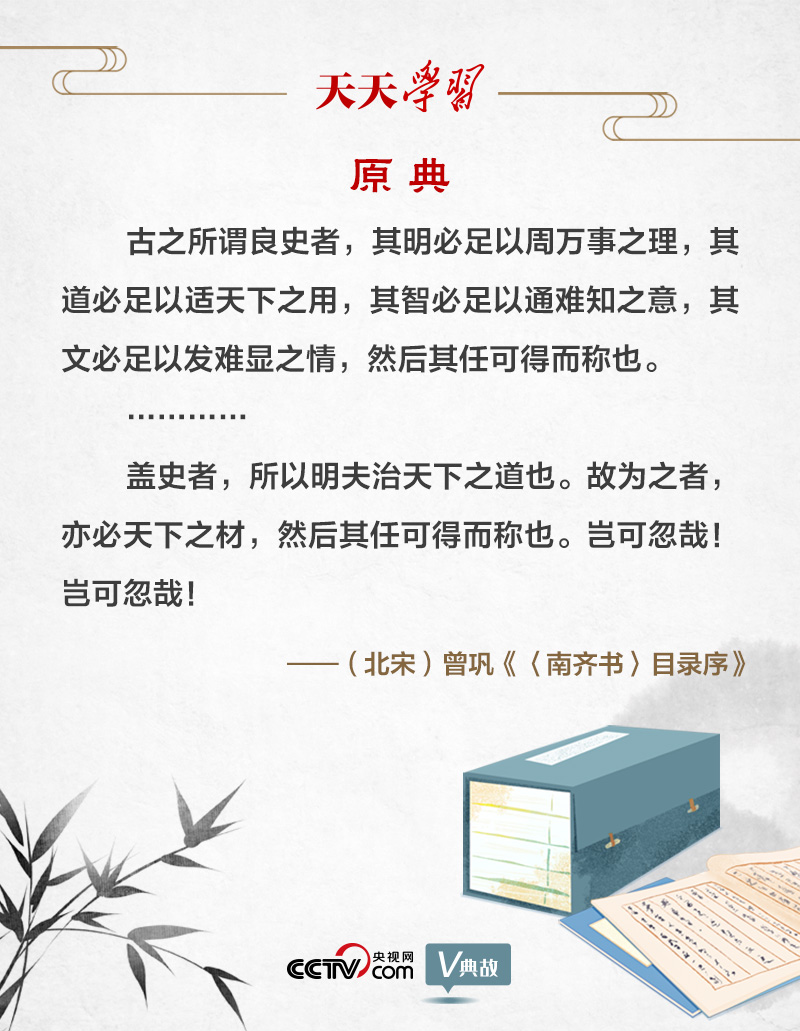 《〈南齊書(shū)〉目錄序》是曾鞏為“二十四史”之一的《南齊書(shū)》所寫(xiě)的一篇序文,體現(xiàn)了曾鞏的史學(xué)研究?jī)r(jià)值取向。文章圍繞著“良史(優(yōu)秀的史官)”二字展開(kāi)。曾鞏認(rèn)為,“古之所謂良史者,其明必足以周萬(wàn)事之理,其道必足以適天下之用,其智必足以通難知之意,其文必足以發(fā)難顯之情”。曾鞏在唐代史學(xué)家劉知幾“史才三長(zhǎng)(才、學(xué)、識(shí))”基礎(chǔ)上,將“良史”的標(biāo)準(zhǔn)引申為四點(diǎn):明、道、智、文。其中,文、明、智相當(dāng)于才、學(xué)、識(shí),而“道”則是曾鞏的發(fā)展,并被擺在核心位置。曾鞏指出,“蓋史者,所以明夫治天下之道也。故為之者,亦必天下之材”。曾鞏認(rèn)為,史書(shū)要闡明治國(guó)安邦的法則和規(guī)律,因此史家必須是兼具明、道、智、文的“天下之材”。他提出史家要發(fā)揮史學(xué)經(jīng)世致用的作用,修史要總結(jié)前朝興亡的經(jīng)驗(yàn)教訓(xùn),為后世提供“法戒”。