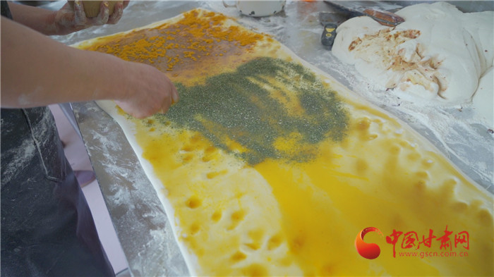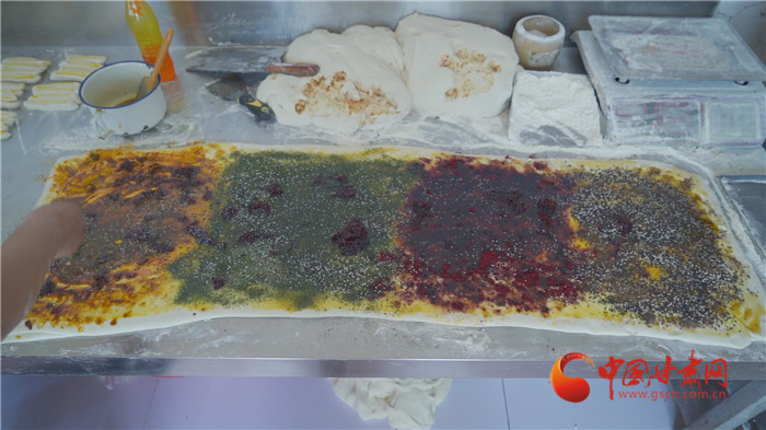 記者走進(jìn)榆中縣金崖鎮(zhèn)浩燕饅頭店,一股濃濃的胡麻油、玫瑰醬、香豆等混合的香氣撲面而來(lái),李浩燕正在忙碌地趕制一批榆中傳統(tǒng)手工月餅。案板上除了發(fā)好的面團(tuán),還擺上了炒胡麻碎、姜黃、白砂糖等豐富的佐料。只見李浩燕從揉面開始,然后鋪餡、搟制、卷面、切分、披花,一道道工序一氣呵成。經(jīng)過(guò)一個(gè)多小時(shí),新鮮美味的月餅出爐了,切開后,內(nèi)里豐富,色彩斑斕,咬上一口軟糯可口,回味留香。