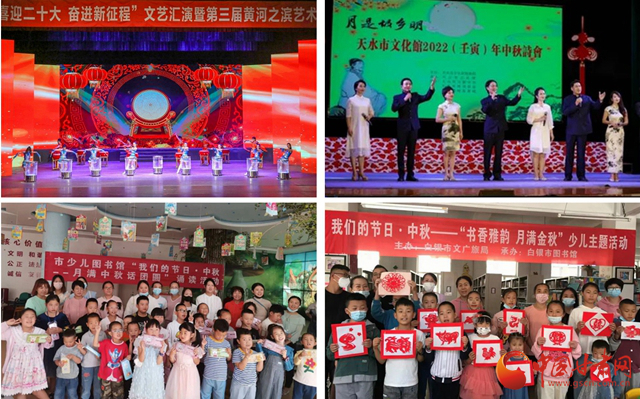 白銀市圖書館以閱讀分享、剪紙?bào)w驗(yàn)、知識答題等形式,為各年齡段讀者打造專屬主題活動;武威書畫名家現(xiàn)場題字作畫,為游客送祝福;張掖“我們的中國夢·文化進(jìn)萬家”中秋慰問演出走進(jìn)社區(qū)街道,豐富群眾文化生活;天水舉辦“月是故鄉(xiāng)明”2022(壬寅)年中秋詩會,以詩會友歡度中秋。