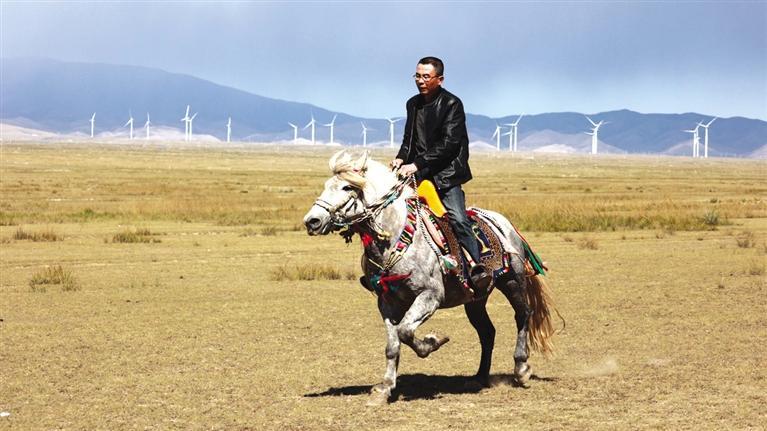 驅車向草原腹地進發(fā),遠遠就能看見有人在馴馬。馴馬者房利軍和他的坐騎“尕青”仿佛“人馬合一”,同呼吸、共步調,一遍遍練習,像走,更像飛。這便是傳說中的走馬文化,和跑馬的加速度不同,走馬不管是走還是跑,都是快步勻速,短途速度快,長途耐力強,騎乘平穩(wěn),姿態(tài)優(yōu)美,觀賞性強。在牧區(qū),走馬實用性強,深受當?shù)厝藲g迎。曾有專家稱,“馬踏飛燕”的“馬”即為走馬。每天,和武威天祝一山之隔的這片草原,都與房利軍有關,在這里,他專心馴馬,而他的500只羊則在一旁撒歡。尤其從高空俯瞰,草原牧羊的畫面甚是壯觀??赐犟Z馬,房利軍騎馬帶路,采訪車沿著馬道回到了“家”。
