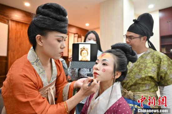 10月9日晚,廣西南寧市一攝影棚內(nèi),南寧傳統(tǒng)服飾復原團隊化妝師鄭若楠依據(jù)陶俑文物圖片為模特上面妝。