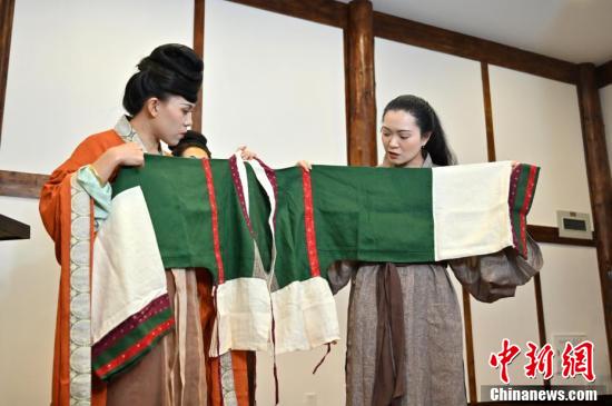 10月9日晚,廣西南寧市一攝影棚內(nèi),漢服復原愛好者、南寧傳統(tǒng)服飾復原團隊成員蔣雨林(右一)介紹其制作的魏晉南北朝時期造型服飾。南寧傳統(tǒng)服飾復原團隊成立于2021年,由18名漢服愛好者自發(fā)組成,多為“90后”。該團隊以全方位復原中國古代服飾造型為方向,以期重現(xiàn)中國傳統(tǒng)服飾之美。