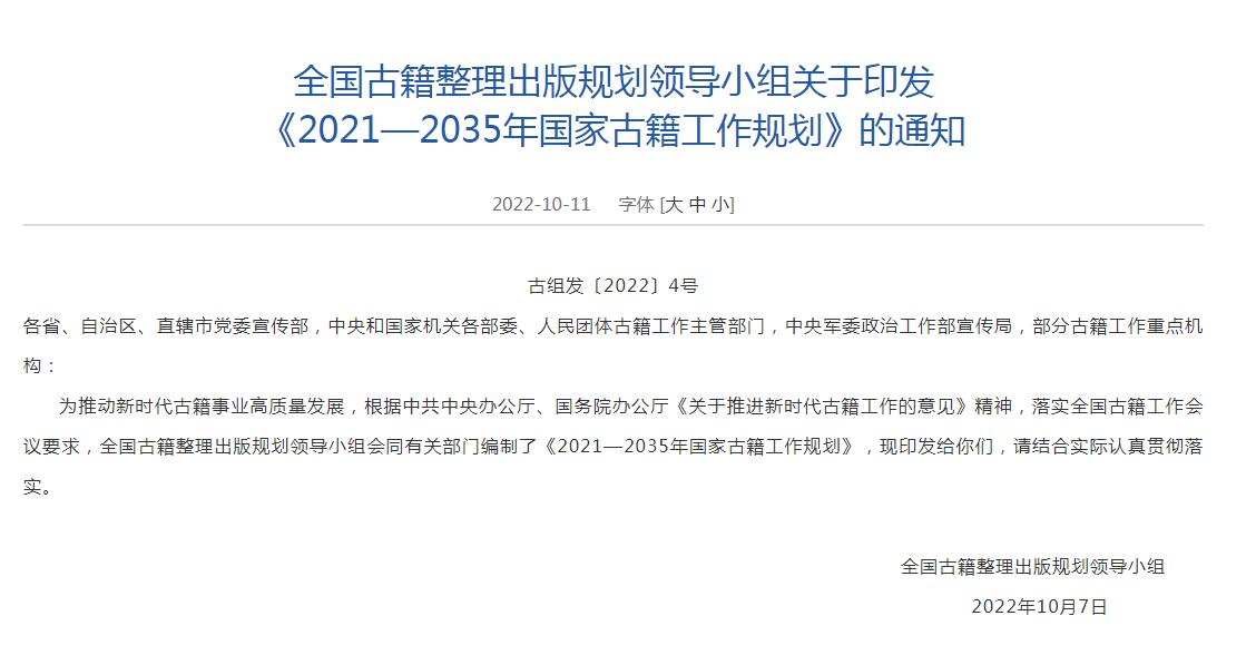 12日,據(jù)國家新聞出版署網(wǎng)站消息,全國古籍整理出版規(guī)劃領(lǐng)導(dǎo)小組會同有關(guān)部門編制了《2021—2035年國家古籍工作規(guī)劃》,其中提到,至2035年,古籍工作體制機制更加完善,以重大工程為引領(lǐng),加強古籍工作全局性謀劃,重點實施 《永樂大典》、敦煌文獻(xiàn)系統(tǒng)性保護整理出版工程等。