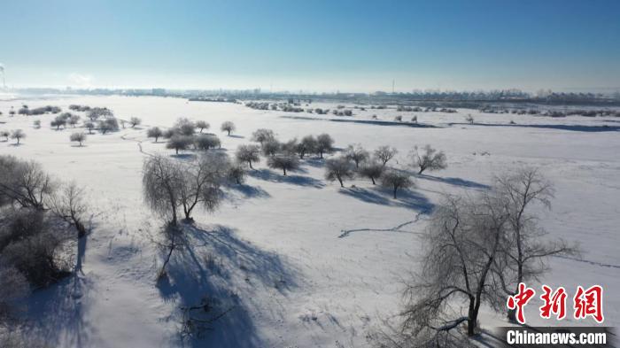 在霧氣的作用下,黑龍江江畔的樹木都披掛了一層冰晶,原本綠色的松柏覆蓋上了一層白紗。遠(yuǎn)遠(yuǎn)望去,一排排青松、楊樹、柳樹的樹冠似煙似霧,與藍(lán)天相接,形成了難得一見的霧凇美景,吸引了許多當(dāng)?shù)鼐用耨v足拍照。