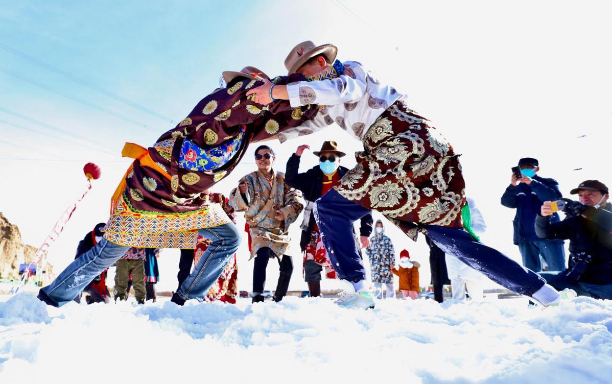 當(dāng)日,“相約文殊山樂(lè)享冰雪趣”,藏族群眾在冰雪運(yùn)動(dòng)場(chǎng)上進(jìn)行雪地鍋莊舞、頂杠子、拔棍、拉爬牛、戶外徒步、雪地摔跤、雪圈滑行追逐、滑冰、電商直播等多項(xiàng)比賽,吸引了周邊群眾和甘肅酒泉、嘉峪關(guān)等地的萬(wàn)名游客前來(lái)參觀游覽和參與比賽。