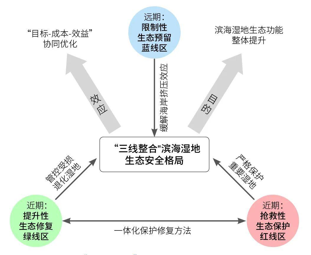 據(jù)此,文章提出了應(yīng)對圍墾開發(fā)和適應(yīng)海平面上升情形下“三線整合”中國濱海濕地生態(tài)安全格局相關(guān)概念,包括:搶救性保護(hù)生態(tài)紅線區(qū),優(yōu)先開展?jié)竦匦迯?fù)的生態(tài)修復(fù)綠線區(qū),以及適應(yīng)氣候變化影響下海平面上升的生態(tài)預(yù)留藍(lán)線區(qū)。文章在剖析相關(guān)概念的基礎(chǔ)上,聚焦我國大江大河三角洲,針對濱海濕地保護(hù)修復(fù)、海岸帶管理和國土空間開發(fā)提出了相關(guān)措施和建議。