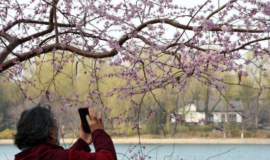 3月8日,一名游客在北京玉淵潭公園拍攝盛開的山桃花。