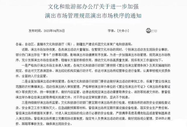 近日,文旅部辦公廳發(fā)布《文化和旅游部辦公廳關(guān)于進(jìn)一步加強(qiáng)演出市場管理規(guī)范演出市場秩序的通知》。通知提到,對臨時搭建舞臺、看臺的演唱會、音樂節(jié)等大型演出活動,文化和旅游行政部門要做好演出現(xiàn)場監(jiān)管,查驗(yàn)演出舉辦單位的演出批準(zhǔn)文件及相關(guān)手續(xù),核驗(yàn)演員信息及演出節(jié)目內(nèi)容,嚴(yán)禁擅自變更演員及演出內(nèi)容,嚴(yán)禁假唱、假演奏等違法違規(guī)行為。
