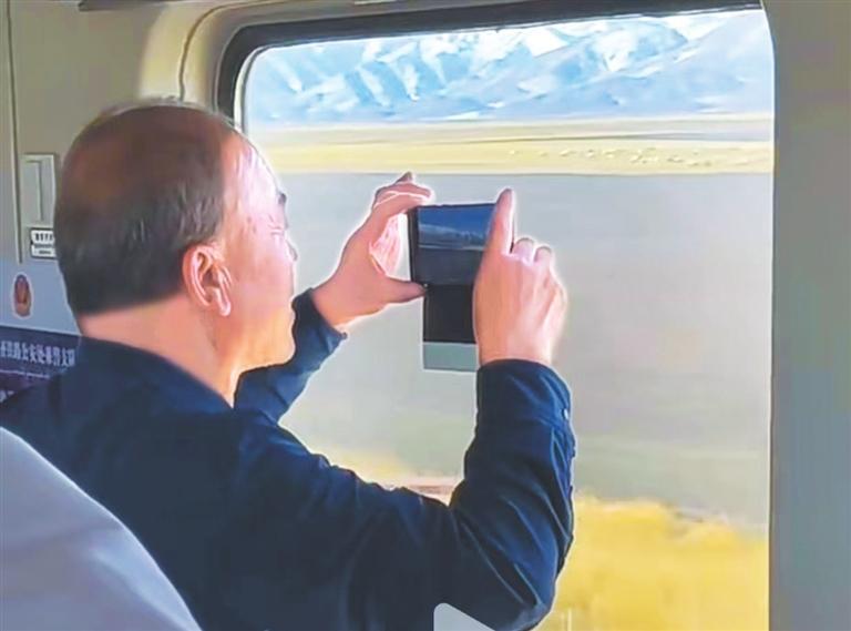 視頻中,一男子舉著手機(jī),透過車窗面對著藍(lán)天、雪山、草原情不自禁地抒情:祁連山下,各族兒女兩千多年來在華夏的文明史上書寫了鞏固民族大業(yè)、實現(xiàn)祖國統(tǒng)一、民族繁榮的恢弘歷史。朋友們,來張掖!感受兩千年的絲綢之路,感悟現(xiàn)代的動車奔跑在祖國的大地上,讓中華在實現(xiàn)偉大復(fù)興的磅礴征程中恢弘勃發(fā)的新長征、新歷史。