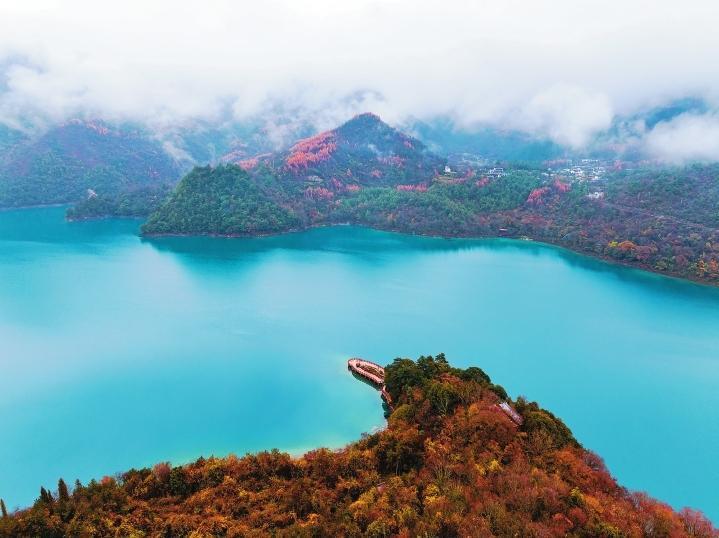 初冬時(shí)節(jié),文縣天池國家森林公園尚未褪去秋裝。遠(yuǎn)山峰巒疊嶂,層林色彩斑斕,近水沉斂如鏡,林木倒映其間。黃葉悄落,波紋漣漪,云霧時(shí)起,水霧彌漫。初冬的天池,靜美如畫卷。