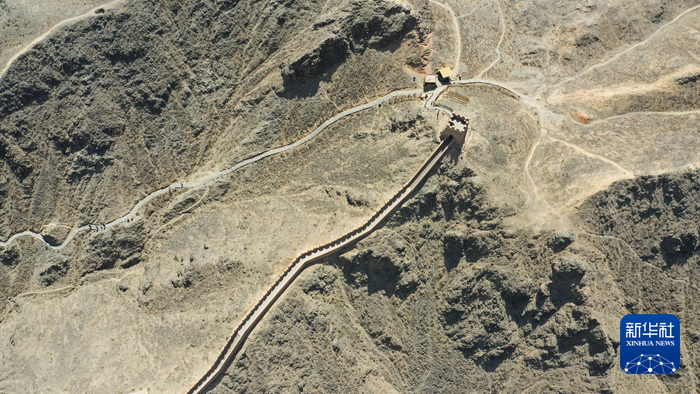 這是5月17日在甘肅省嘉峪關(guān)市拍攝的懸壁長(zhǎng)城(無(wú)人機(jī)照片)。新華社記者 陳斌 攝